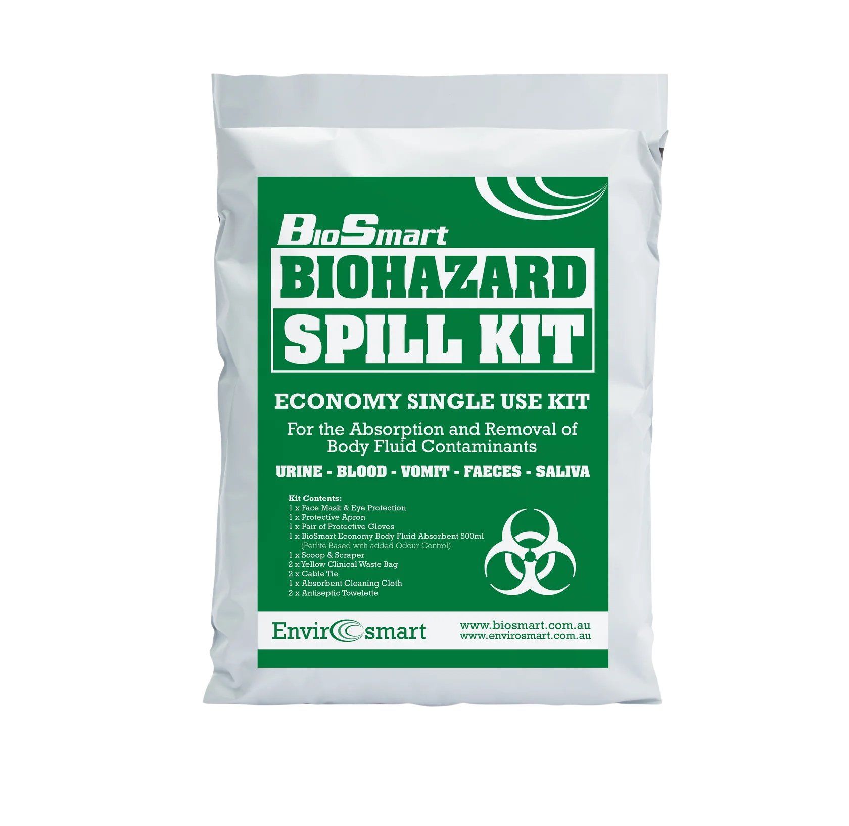 BioSmart Economy Biohazard Spill Kits are a cost effective first response spill kit for fast and safe cleaning and removal of urine, vomit, blood, saliva and faeces. These spills need to be handled properly. To assist you, we provide Clear Directions and Personal Protective Equipment for your safety together with our Perlite based BioSmart Economy Body Fluid Absorbent. These compact kits can be easily carried in vehicles and make a valuable addition to your First Aid Kit.